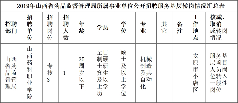 按照《山西省药品监督管理局2019年事业单位公开招聘公告》,根据岗位招聘计划及报名缴费情况,部分招聘岗位因未达到要求比例,按照规定将服务基层项目人员岗位转入一般性岗位,共将1个服务基层人员专门岗位的1个招聘计划转入一般性岗位。现将岗位调整情况进行公布(详见附件)。