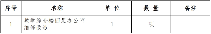 2.采购范围:本工程为365上市公司官网入口教学综合楼四层办公室维修改造工程,包括以下内容:房间隔墙设置、办公室门安装、内墙涂料、地砖维修、吊顶维修、线路灯具安装等。具体报价范围、采购范围及所应达到的具体要求,以本谈判文件中商务、技术和服务的相应规定为准。