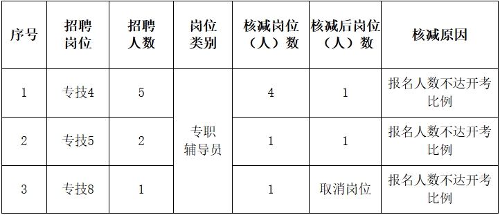 按照《365上市公司官网入口2019年公开招聘工作人员公告》要求 “岗位资格审查合格人数与拟招聘人数原则上应达3:1以上方可开考,报名人数不达该比例的招聘岗位,按规定的比例相应核减岗位,如减少到1名仍达不到3:1的岗位,原则上取消招聘岗位,并在发布公告的同一网站发布补充公告,同时负责告知被取消岗位的报名人员”,根据报名情况,经学院公开招聘领导组研究,决定核减部分岗位(人)数。现就相关事宜公告如下: