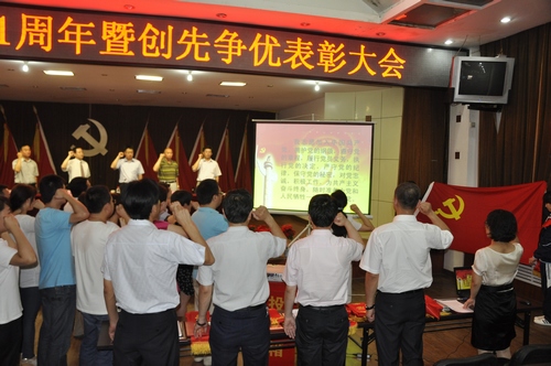 组织人事部副部长杨芳同志领誓下,新党员面对党旗进行入党宣誓,院党委全体成员和全体党员共同重温入党誓词,郑重地发出了“履行党员义务、为共产主义奋斗终身”的共同心声。