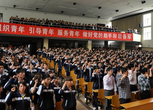 大会在庄严的国歌声中拉开帷幕。会上表彰了2011年度 “五四红旗团支部”、“优秀共青团干部”、“优秀共青团员”、“优秀青年志愿者”、“文明学生”、“文明教室”、“文明宿舍”、“学雷锋志愿服务优秀个人”等先进集体和优秀个人。出席大会的领导为获奖的先进集体和先进个人代表颁奖并为新团员代表佩戴团徽,全体新团员进行了庄严而神圣的入团宣誓仪式,参会老团员一同重温入团誓词。