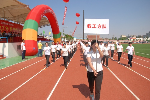 在学院国旗仪仗队护卫的五星红旗引领下,伴随着军乐队雄壮的运动员进行曲,彩旗队、花束队、裁判员方队、教师方队和各班运动员方队迈着整齐矫健的步伐,喊着嘹亮的口号,昂首阔步依次通过主席台。