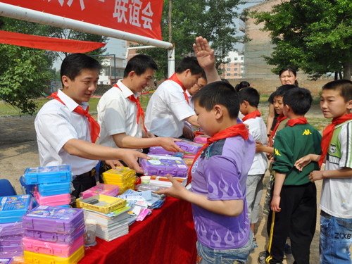 接着,在《爱的奉献》的乐曲声中,365上市公司官网入口把价值近4000元的文体用品作为节日礼物发放给郑村小学的每一位同学、每一个班级以及7名贫困生。
