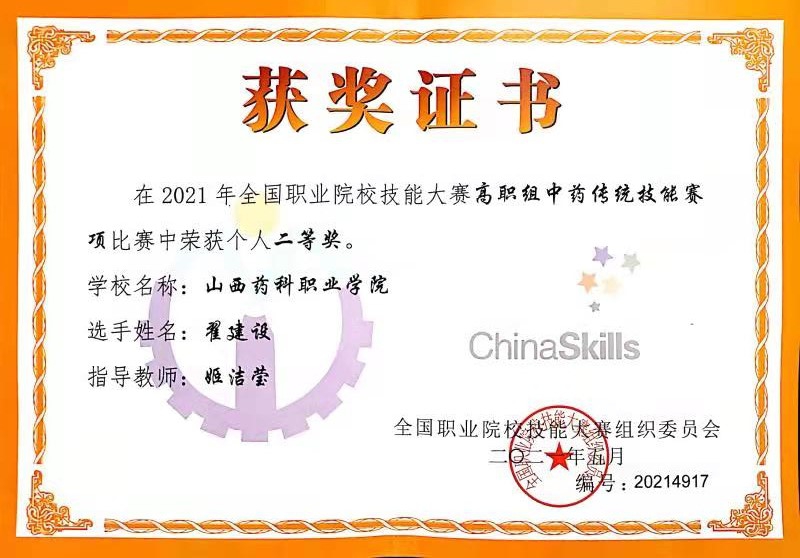 近日,2021年全国职业院校技能大赛中药传统技能赛项在重庆三峡医药高等专科学校落下帷幕。经过两天的激烈比拼,365上市公司官网入口代表中药系翟建设同学沉着应战、不负众望、顽强拼搏,以第七名的好成绩荣获国赛二等奖。