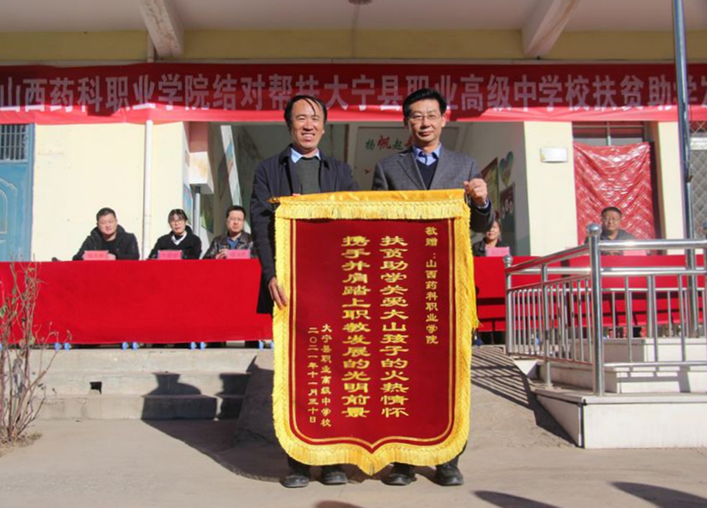 在大宁县职业高级中学校,张震云一行与学校教师代表进行交流座谈,为学校25名家庭困难学生发放助学金,并接受了学校赠送的锦旗。