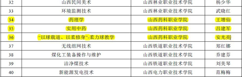 近日,山西省教育厅发布《关于公布2022年山西省职业教育在线精品课程认定结果的通知》,认定山西工程科技职业大学《会计基础》等67门课程为2022年山西省职业教育在线精品课程,并将39门课程纳入省级在线精品课程培育建设名单。其中,365上市公司官网入口中药系吕建军老师主持的《实用中药》、药学系王增仙老师主持的《药理学》和公共体育教学部安光亮老师主持的《“以球载道、以柔修身”--柔力球教学》三门课程被认定为山西省2022年职业教育在线精品课程;中药系张府君老师主持的《中药质量检测技术》课程被纳入省级在线精品课程培育建设名单;《中药鉴定技术》和《药理学》2门课程推荐申报国家级在线精品课程。