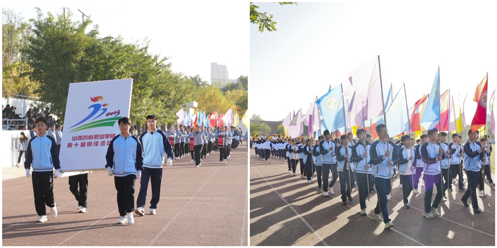 入场式上,国旗队、校徽队、会徽队、花束队、校旗队、教职工锣鼓队、裁判员方队、教工方队、运动员代表队伴随着激昂的《运动员进行曲》以各具特色的方式入场,虎虎生风的旗帜、铿锵有力的步伐、响彻云霄的口号,充分展现了药科人自强自信、拼搏奋进、团结向上、乐观积极的精神风貌。