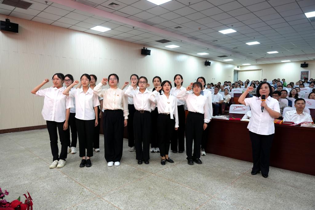 “我宣誓!我志愿成为一名人民教师,忠诚党的教育事业……”在大会举行的新入职教师宣誓仪式上,铿锵有力的誓言宣告着教育事业的生力军将紧跟老一辈育人楷模的坚定步伐,接过老教师手中的接力棒,开启教书育人的职业生涯。