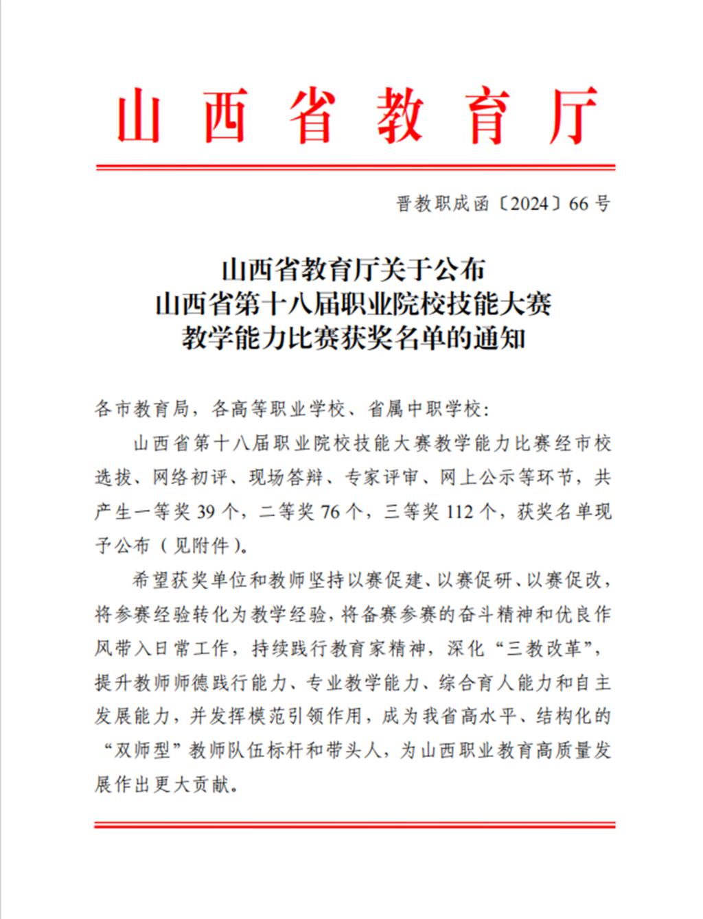 9月9日,山西省教育厅公布了山西省第十八届职业院校技能大赛教学能力比赛获奖名单,由365上市公司官网入口教师张府君主持,郎超、张妤、张孟容参与的团队在此次大赛中齐心协力、努力比拼,斩获高职组一等奖。此外,365上市公司官网入口陈湘玲团队、刘文娟团队、王海花团队、杨兆艳团队也不负众望,分别荣获高职组三等奖。