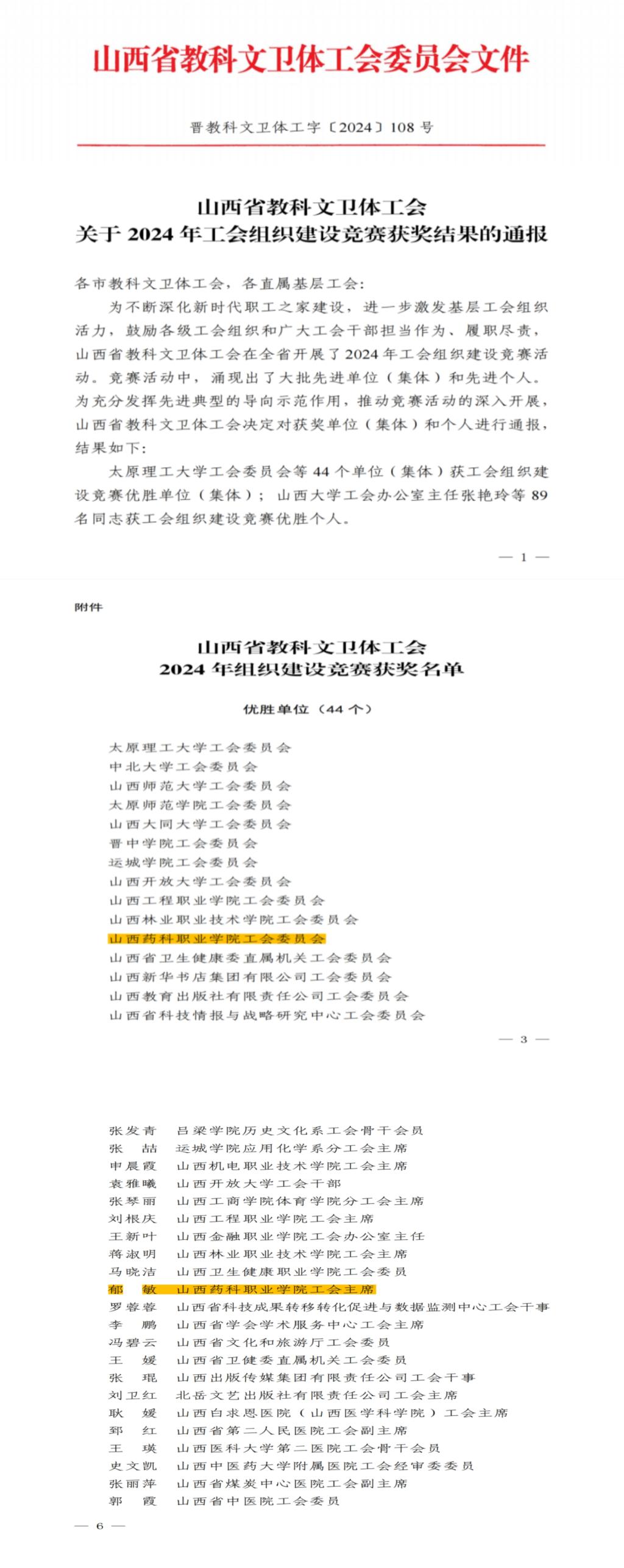 近日,山西省教科文卫体工会公布2024 年工会组织建设竞赛获奖名单,365上市公司官网入口工会喜获“山西省教科文卫体工会2024年工会组织建设竞赛优胜单位(集体)”、工会主席郁敏同志喜获“山西省教科文卫体工会2024年工会组织建设竞赛优胜个人”。