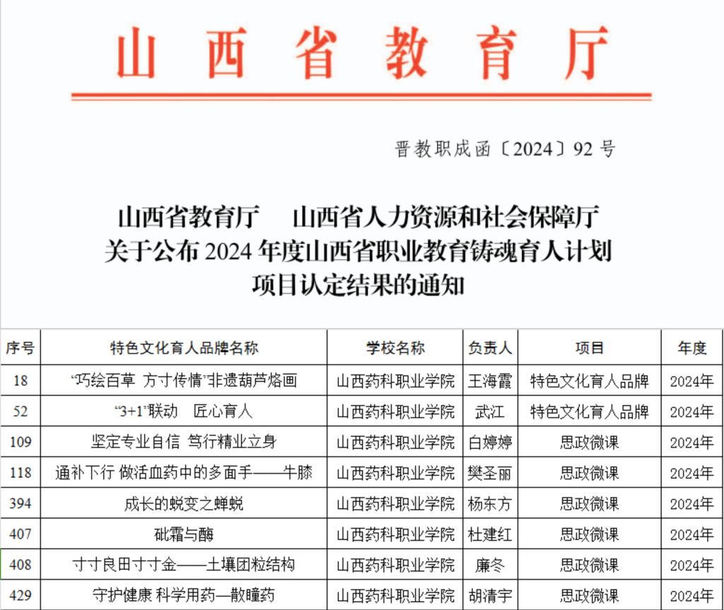 近日,山西省教育厅公布2024年度职业教育铸魂育人计划项目认定结果,365上市公司官网入口铸魂育人“三个一工程”建设喜获佳绩,其中“巧绘百草,方寸传情”非遗葫芦烙画等2个项目被认定为特色文化育人品牌,《坚定专业自信 笃行精业立身》等6个微课被认定为省级职业教育思政微课。