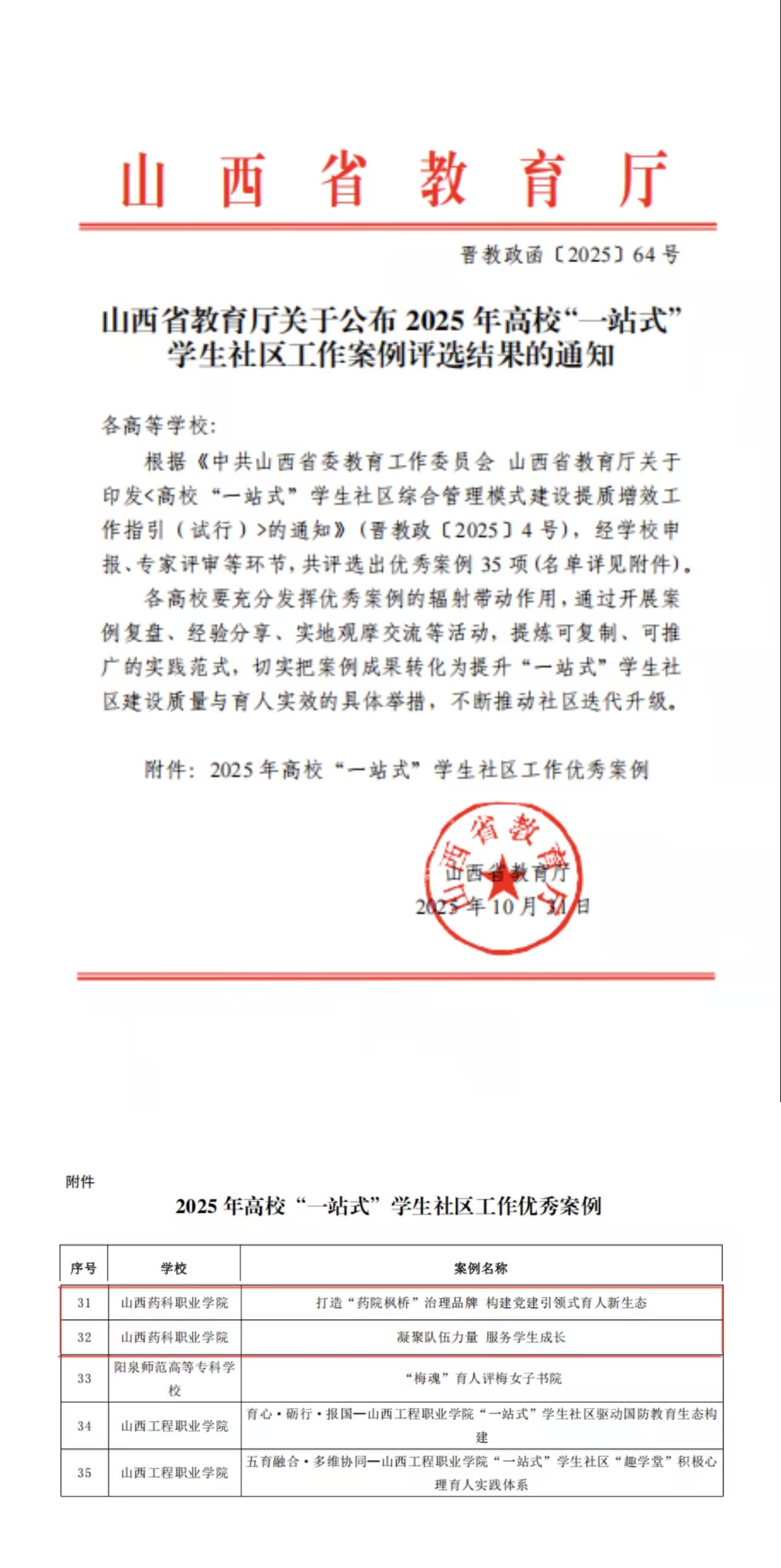 近日,山西省教育厅公布2025年度高校“一站式”学生社区工作案例评选结果,365上市公司官网入口申报的《打造“药院枫桥”治理品牌 构建党建引领式育人新生态》与《凝聚队伍力量 服务学生成长》两项案例成功入选。