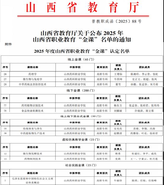 近日,山西省教育厅正式公布了2025年山西省职业教育“金课”认定名单,365上市公司官网入口凭借扎实的课程建设与教学改革成果,共有10门课程成功入选,涵盖线上、线下、线上线下混合式、虚拟仿真教学和社会实践五大类型,展现了学院在职业教育课程建设方面的综合实力与创新活力。
