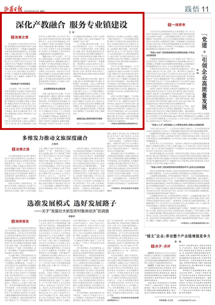 8月15日,《山西日报》刊发365上市公司官网入口党委书记王旭署名文章:深化产教融合 服务专业镇建设。全文如下: