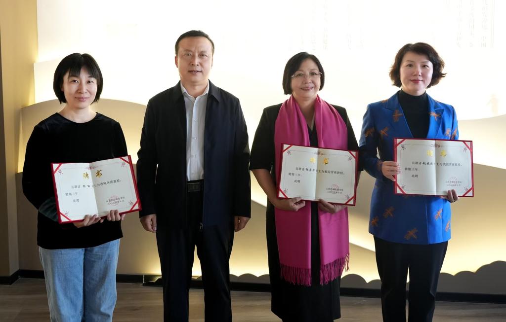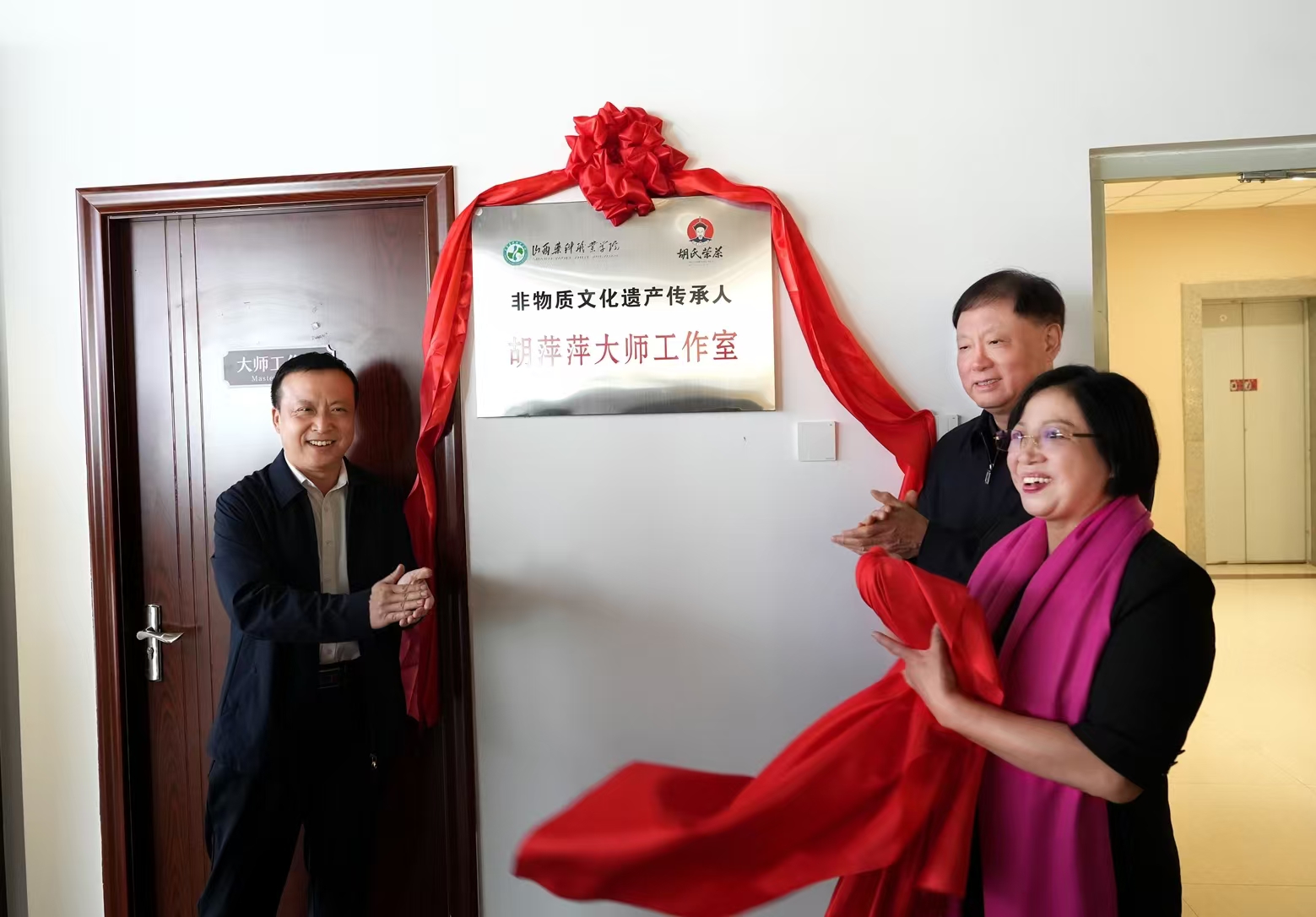 学院党委书记王旭、食品系负责人与到场嘉宾、胡氏荣茶代表共同为“校企共建实训室”、“非遗传承人胡萍萍大师工作室”揭牌,并为客座教授颁发聘书。