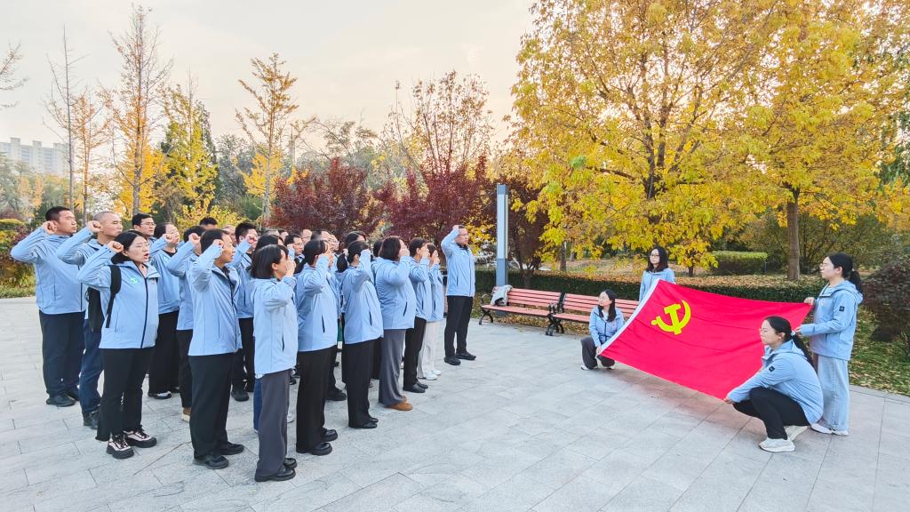在国防主题广场,全体党员面向中国共产党党旗,重温入党誓词,铭记入党初心,坚定了为党和人民教育事业奋斗终身的决心。