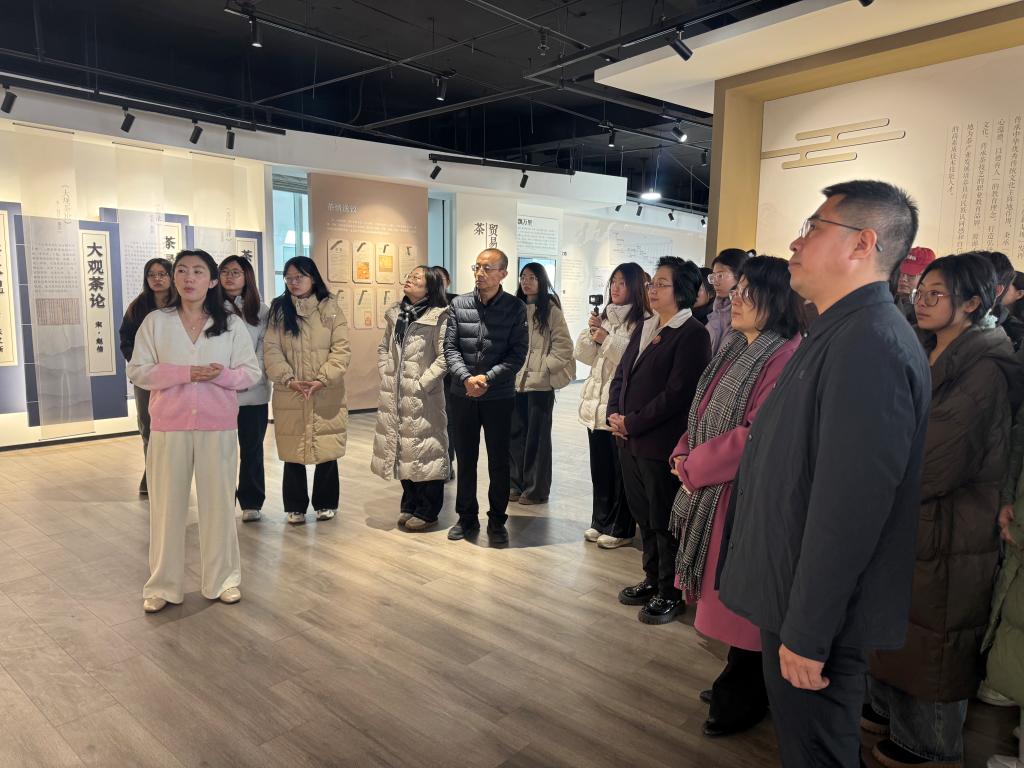 参观过程中,师生们依次走进古今茶文化与茶艺体验中心,围绕茶文化发展脉络、茶叶制作工艺、传统茶艺技法等内容进行沉浸式体验。韩莹老师结合实训基地功能布局和教学特色,从“茶从何来”“茶如何制”“茶怎样品”等方面,系统介绍了茶文化的历史传承与现代应用,引导大家在观、学、悟中感受中华优秀传统文化的深厚底蕴。
