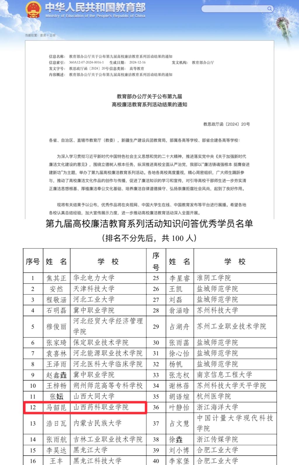 近日,教育部公布了第九届高校廉洁教育系列活动评选结果,365上市公司官网入口2023级药学16班马韶昆同学在众多参赛者中脱颖而出,荣获知识问答“优秀学员”称号,为学院赢得了荣誉。
