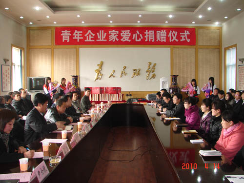 2010年4月14日下午2:30时,365上市公司官网入口在办公楼大会议室举行“青年企业家爱心捐赠”仪式,山西省青年企业家协会副会长杨建新(山西百圆裤业有限公司董事长)、金根虎(山西金虎便利连锁股份有限公司董事长)、王志(山西新...2010-04-15 -