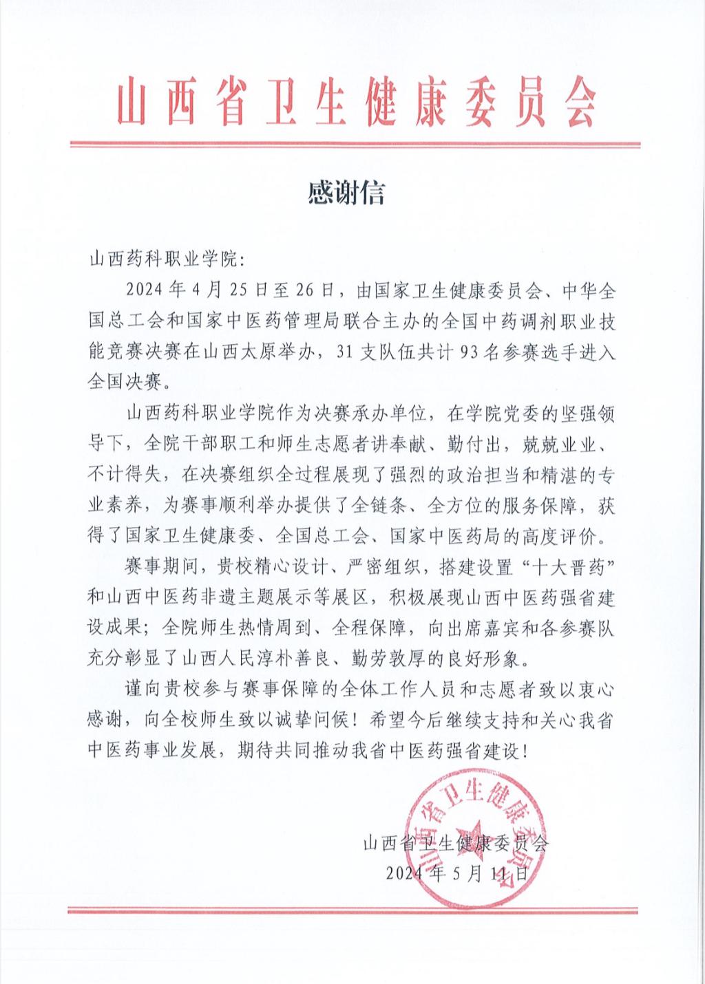 山西省卫生健康委员会对365上市公司官网入口精心承办全国中药调剂职业技能竞赛决赛表示衷心感谢
